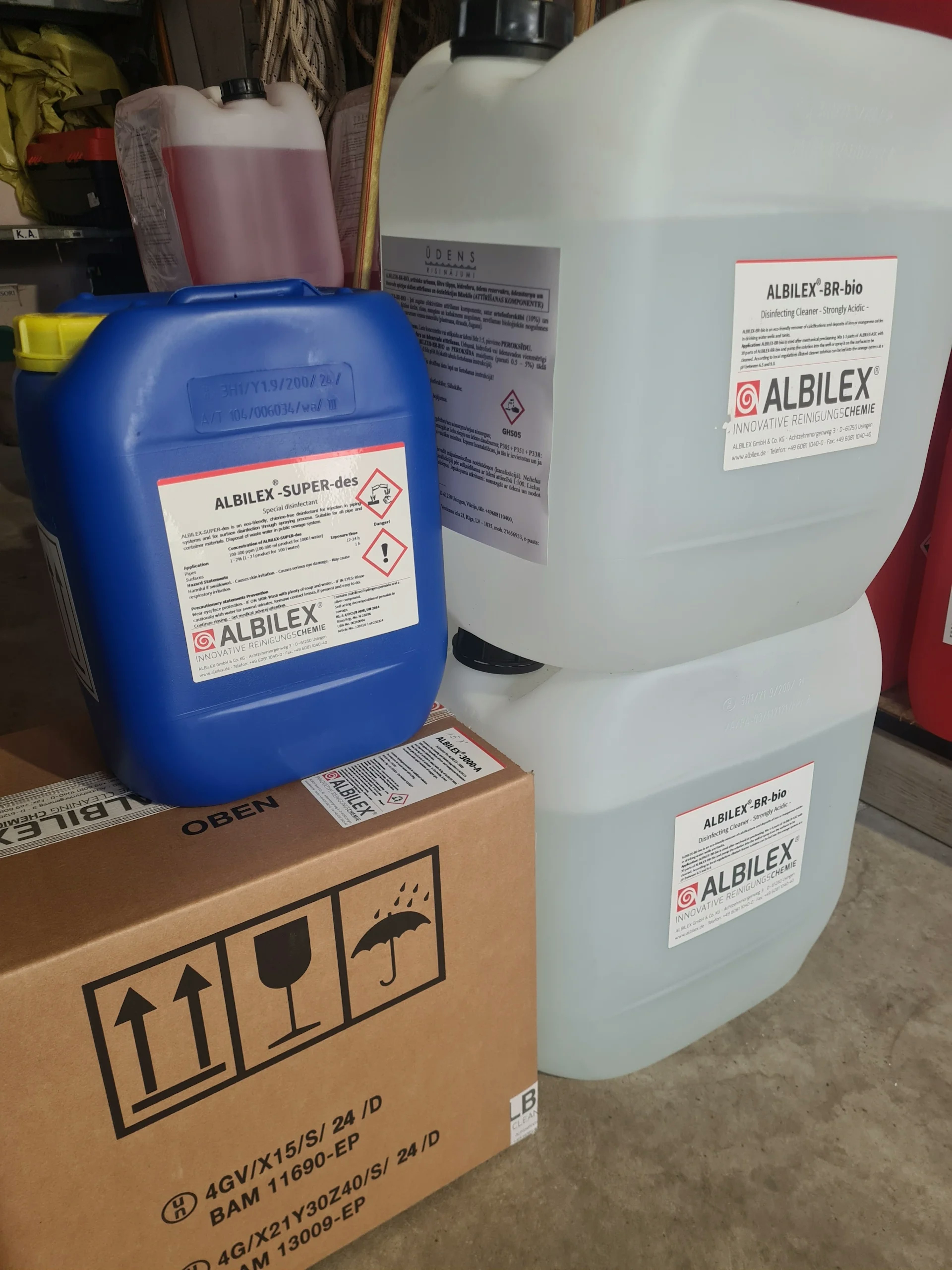 + ūdens sistēmu attīrīšanas un dezinfekcijas līdzekļi ALBILEX® - skābi saturoši attīrīšanas līdzekļi, peroksīds (ūdeņraža pārskābe), hlors, hlora tabletes